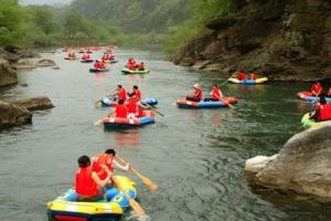 漂流河道全長10公里,落差12余米,河水清澈,兩岸環山,依山而下,兩岸樹木蔥郁,水繞山行,連綿起伏,時而浪遏飛舟,時而穩水小汀,水鳥云集,魚翔淺底。沿途經過滿天星、仙人洞、野鴨灣、礫石灘等多處天然奇景,令游人流連忘返。在這里休閑旅游,讓人耳目一新,心曠神怡。